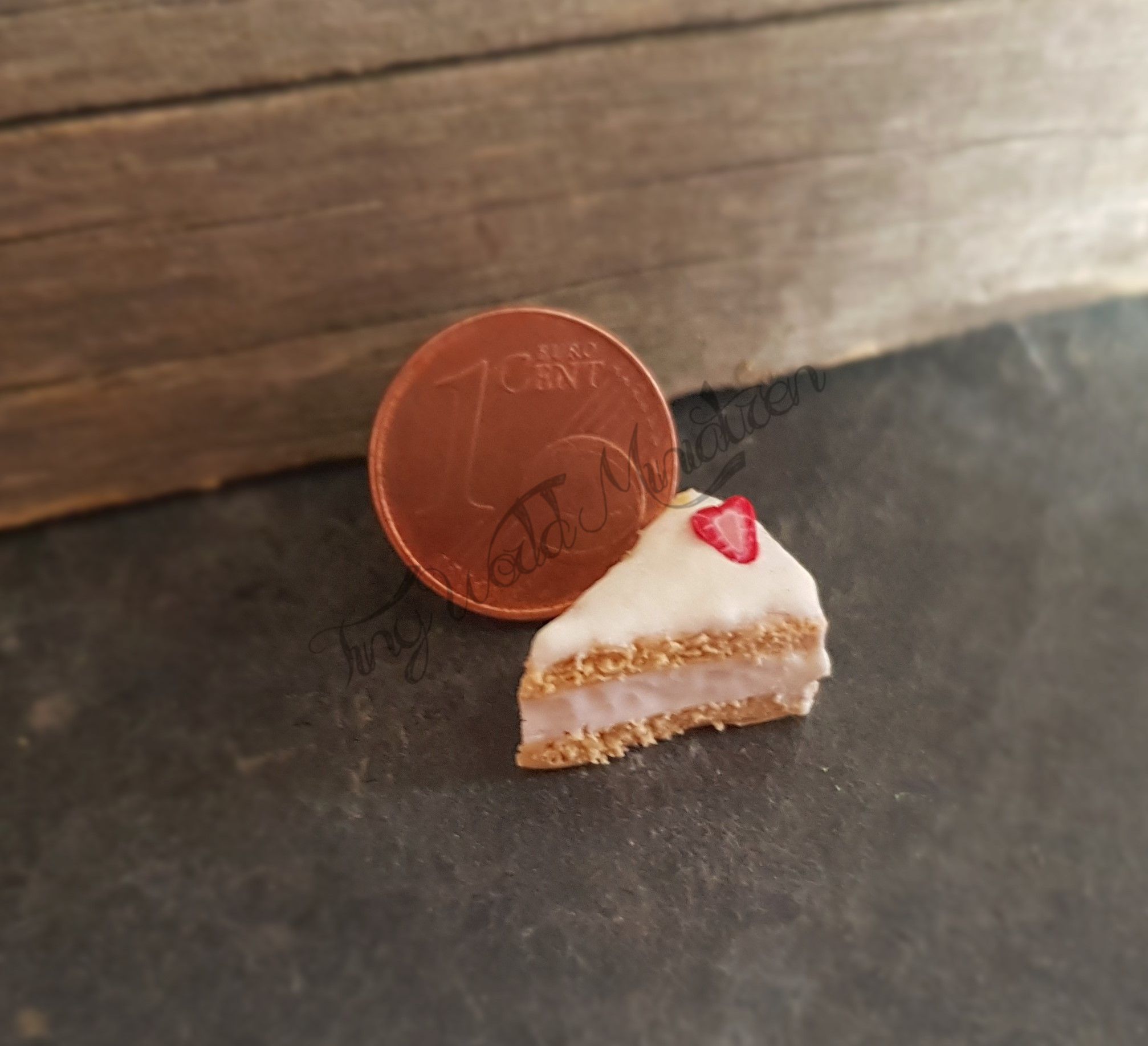 Ein kleines Stück köstliche Sahnetorte (L: ca. 1,6 cm, H. ca. 9 mm) mit Erdbeergarnitur für das Kaffeekränzchen im Puppenhaus.