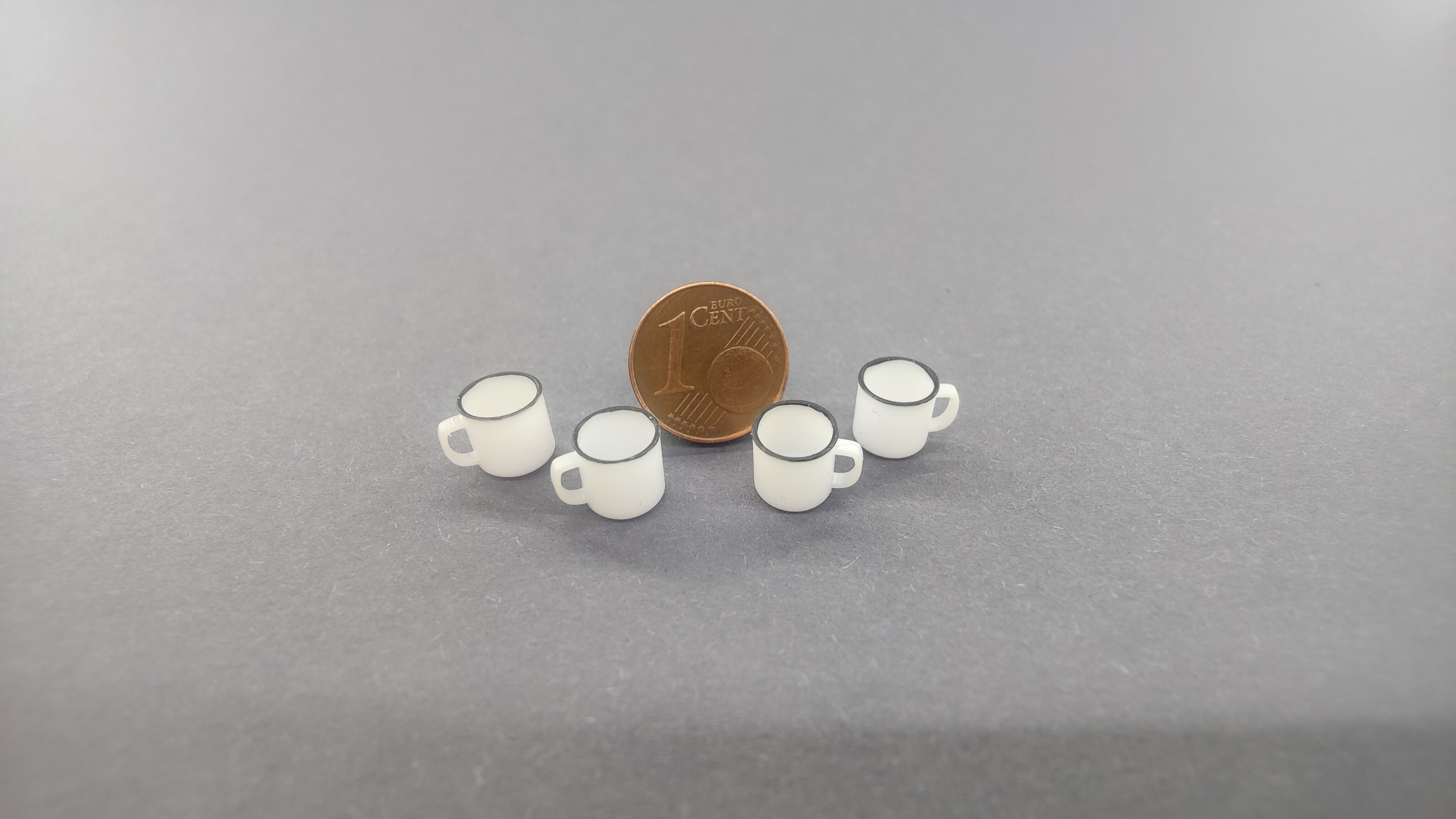 4 weiße Emaille-Tassen mit schwarzem Rand (Größe ca. 0,8 x 0,75 cm).