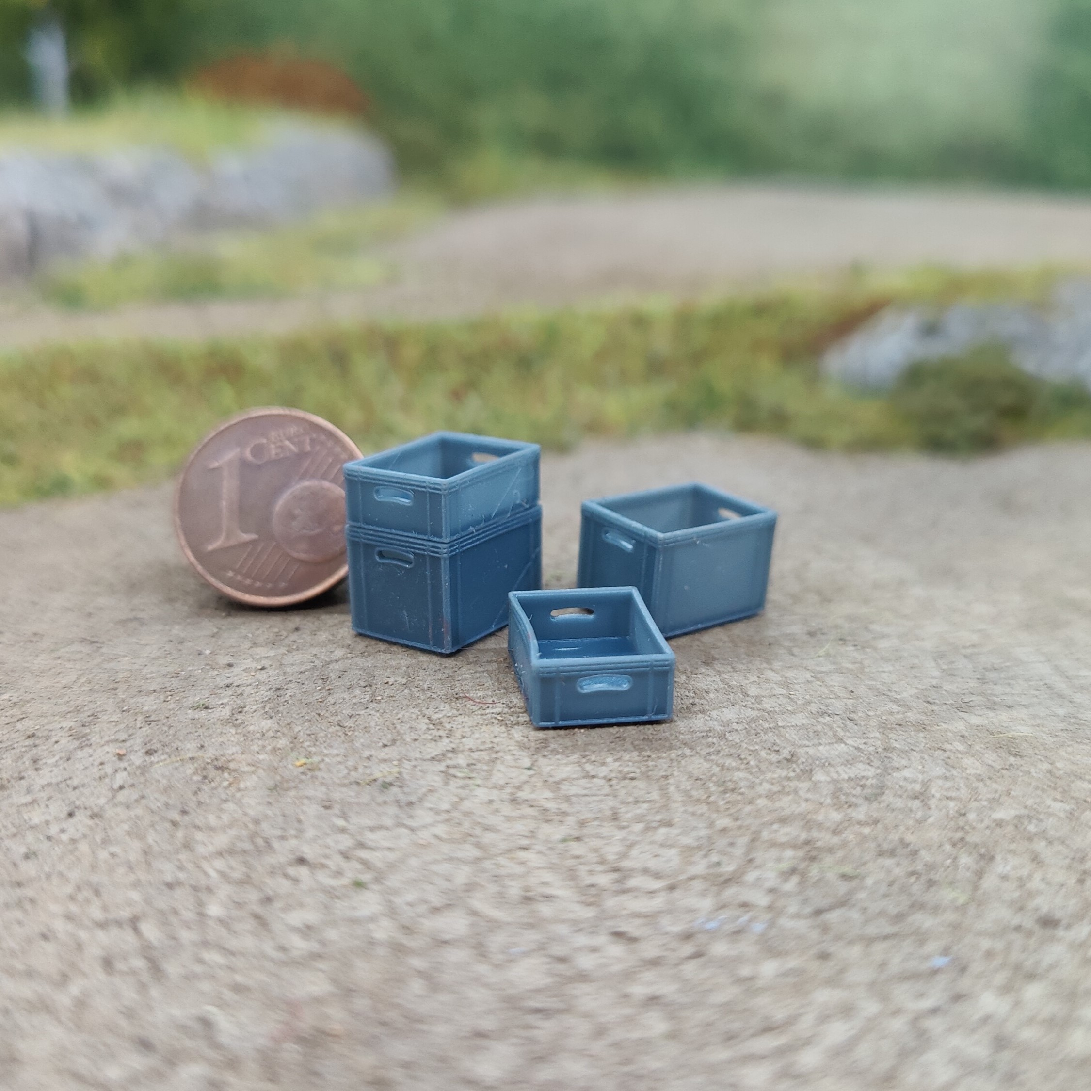 4 Stapelkisten (2 Kisten ca. 9,4 x 12,5 x 4,7 mm, 2 Kisten ca. 9,4 x 12,5 x 8,5 mm ) zur Ausgestaltung Ihrer Modellbahn.