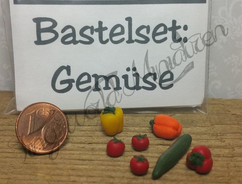 Mit diesem Set kann man eine Gurke, 3 Paprika und 3 Tomaten selbst basteln (fertige Muster siehe rechts auf dem Foto). Enthalten sind 4 kleine Stücke Fimo jeweils in den Farben gelb, orange, rot und grün, ein Zahnstocher zum Modellieren sowie eine ausführliche Bastelanleitung.