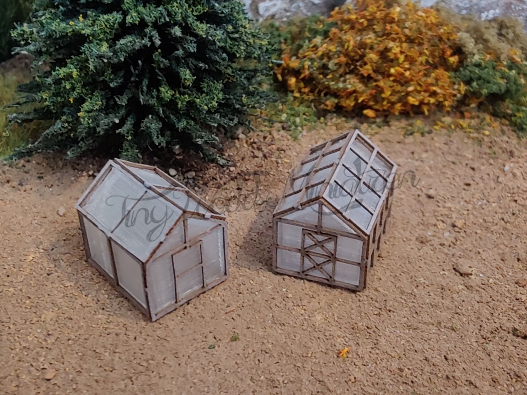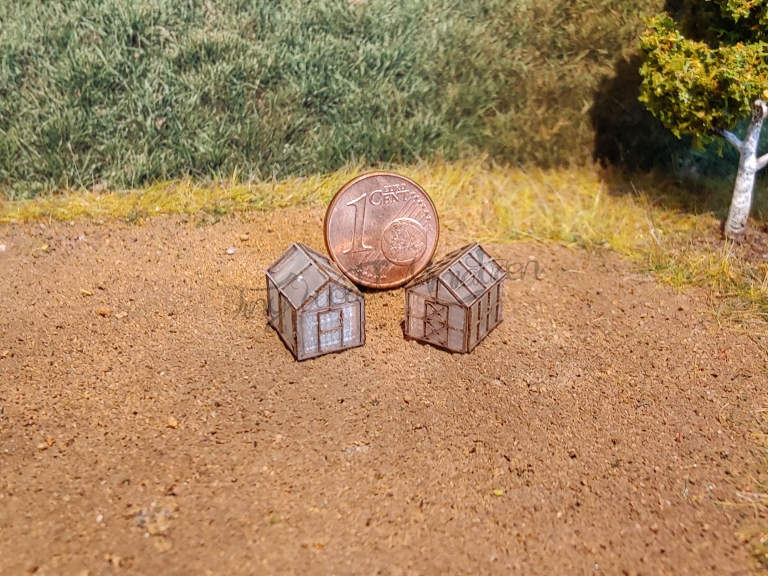 Der Bausatz enthält 2 Gewächshäuser (Maße ca. 11 x 9 x 10 mm) mit zwei verschiedenen Rahmenvarianten zur Ausgestaltung Ihrer Modellbahn.