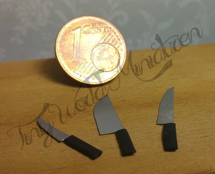 Das Set besteht aus 3 Messern mit schwarzem Griff in verschiedenen Größen (Längen ca. 2,5 cm, 1,7 cm und 1,4 cm) für Kochszenen im Puppenhaus.