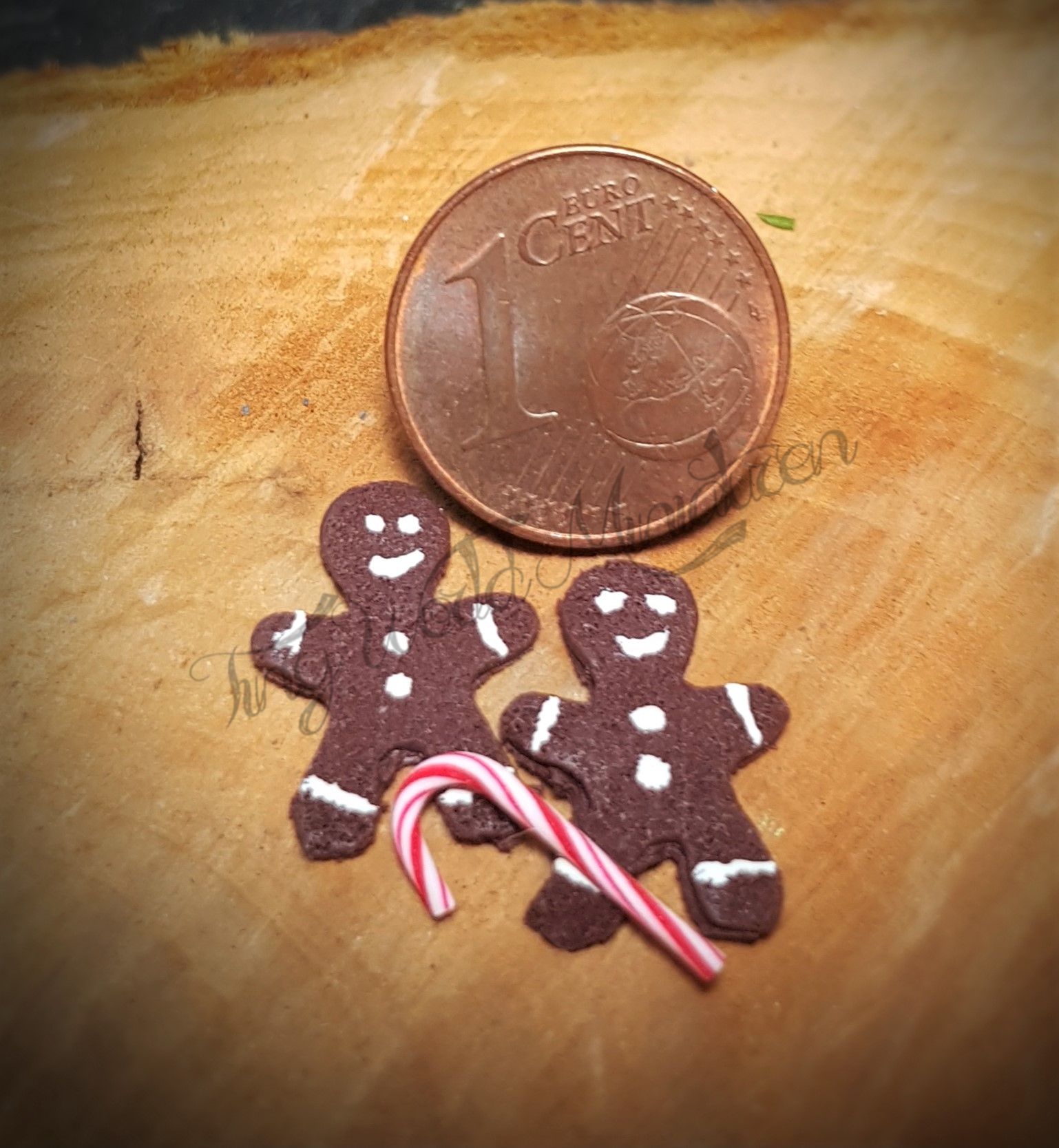 2 Lebkuchenmännchen (ca. 1,5 x 1 cm) inkl. einer Zuckerstange rot/weiß (Laenge. ca. 1,5 cm).