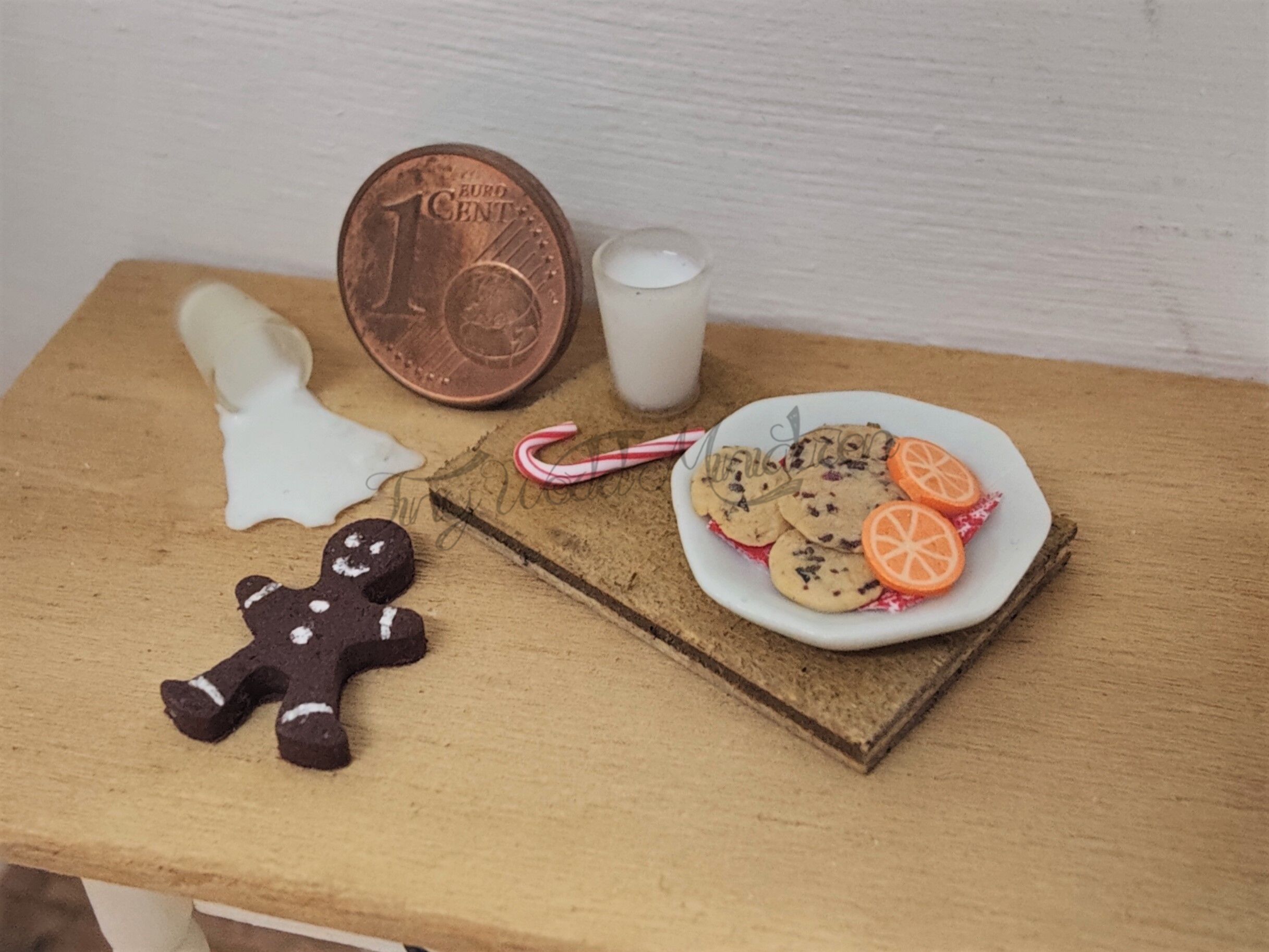 Das Set besteht aus einem kleinen Holzbrett mit einem vollen Glas Milch, einer Zuckerstange und einem Keks-Teller und ist ca. 2 x 3 cm groß. Außerdem enthalten ist ein umgefallenes Glas mit ausgelaufener Milch und ein Lebkuchenmännchen.