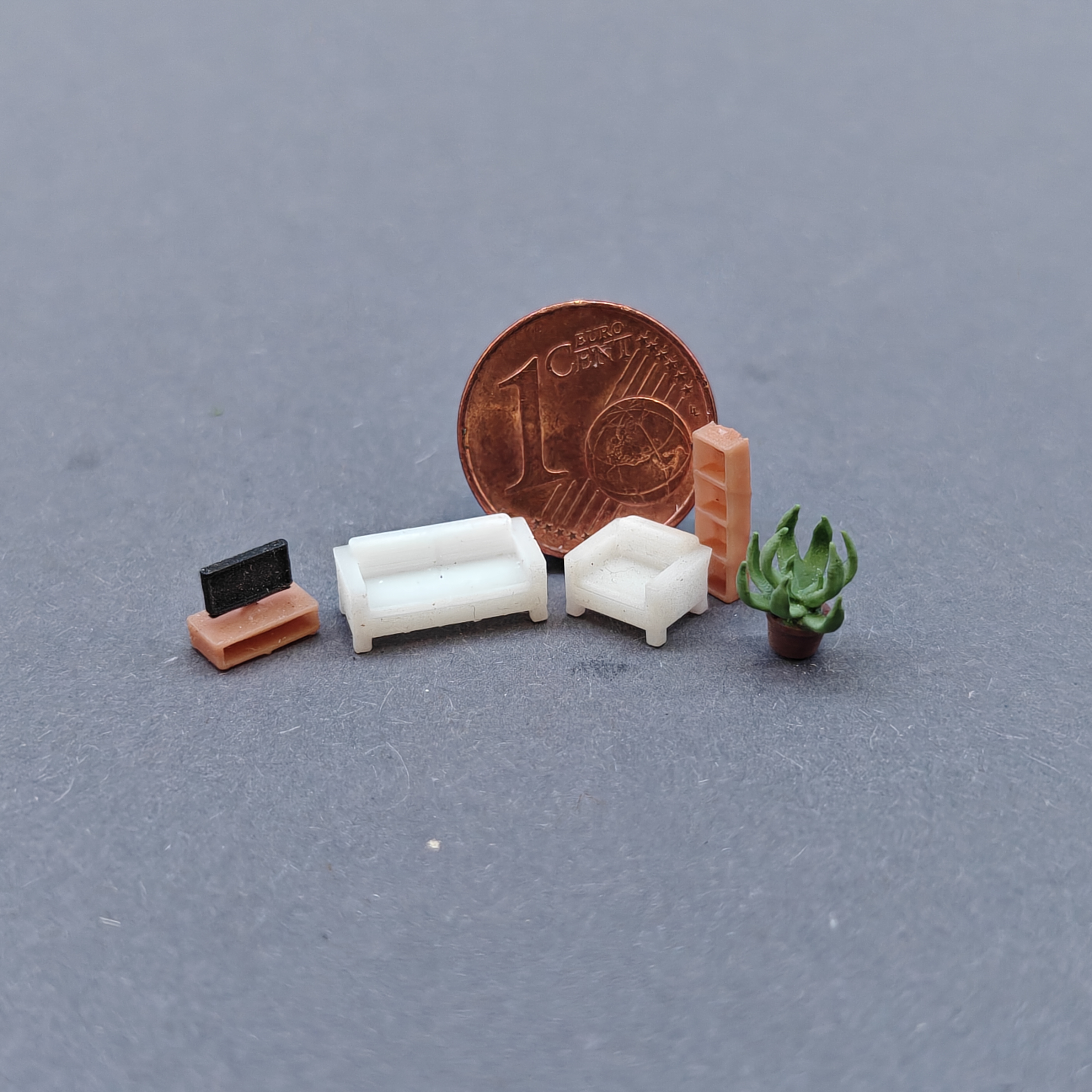 Dem Set liegen ein Sofa, ein Sessel, ein Schrank, ein Fernseher mit Unterschrank und eine Zimmerpflanze bei.