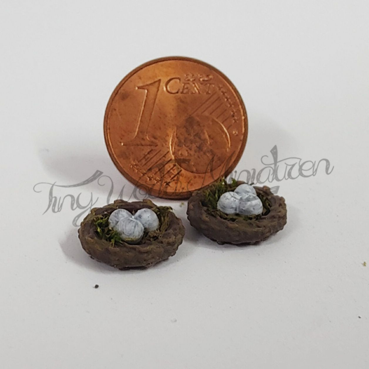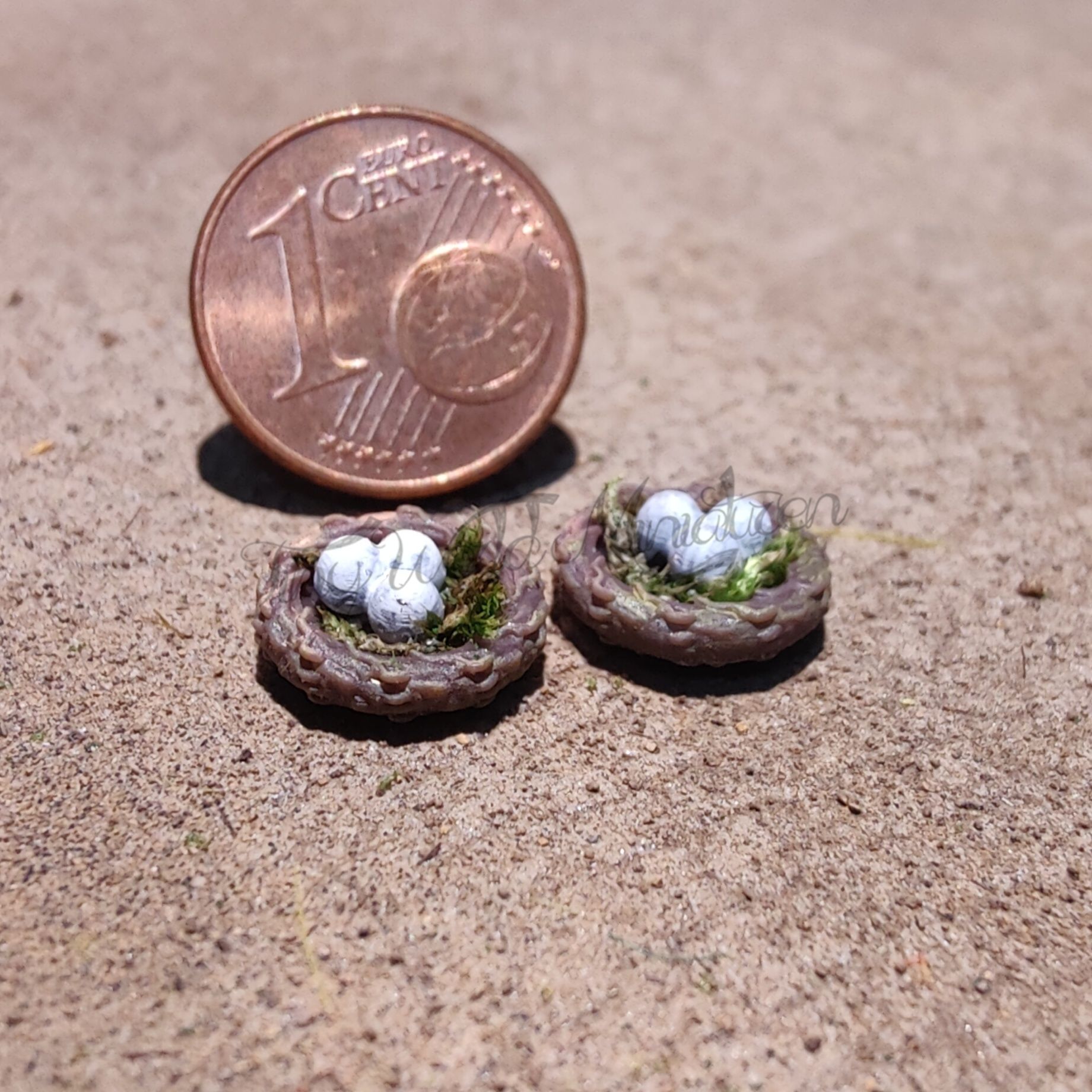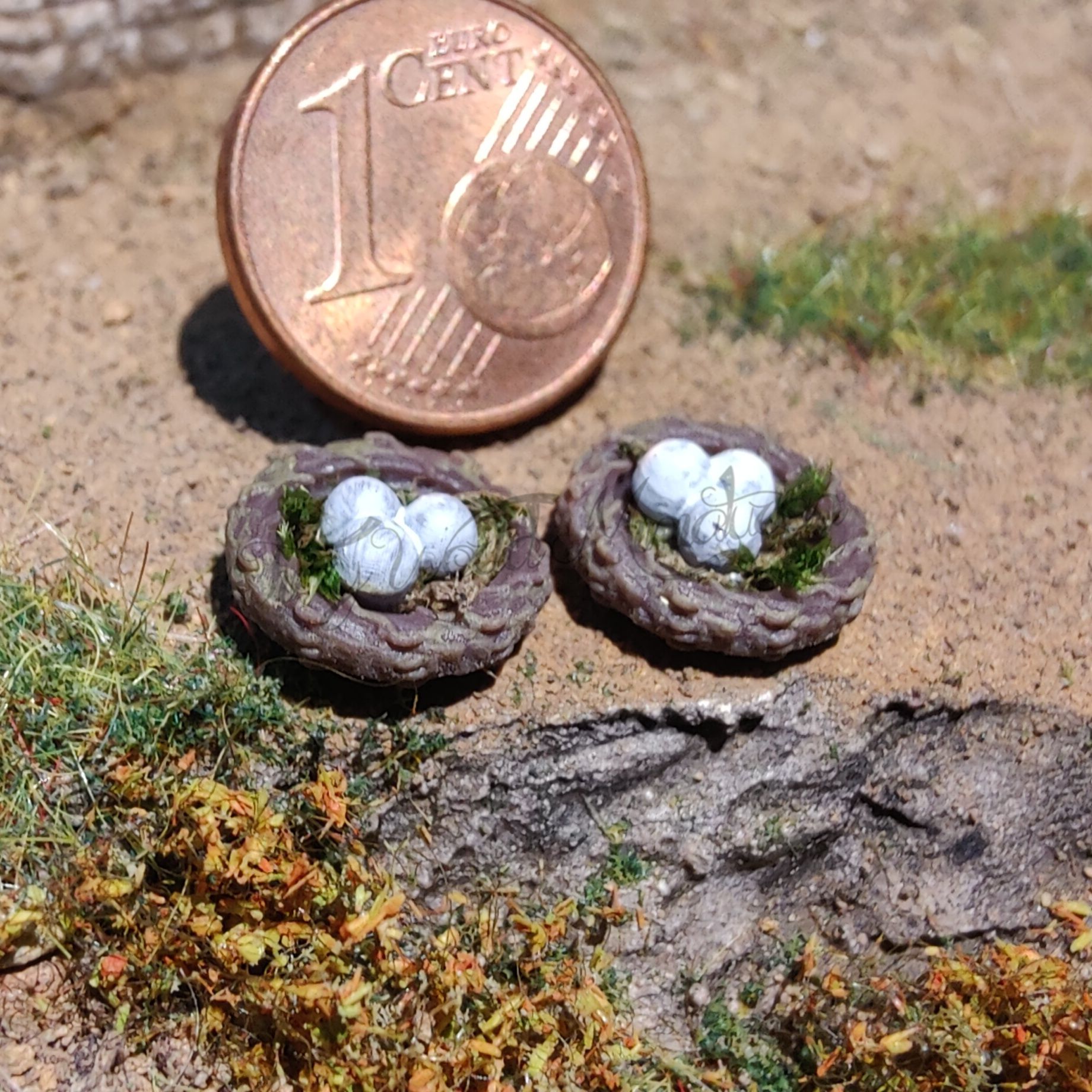 2 Vogelnester (Maße ca.10 x 4 mm) mit Moos und 3 Vogeleiern zur Ausgestaltung Ihrer Gartenbahn.