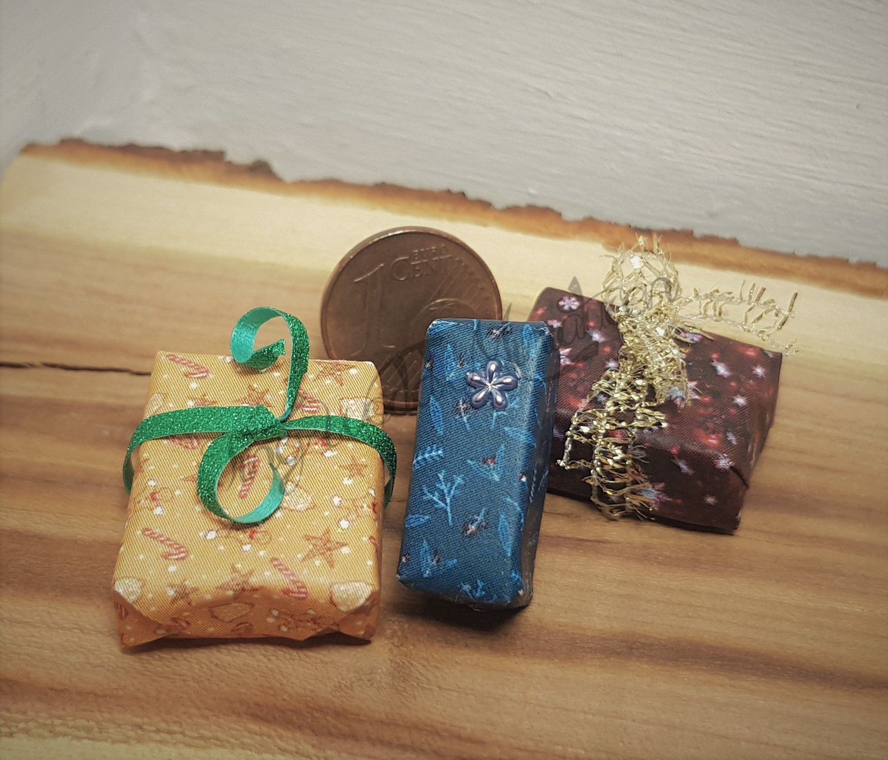 3 kleine verschiedenfarbig verpackte Weihnachtsgeschenke mit Schleifen oder Stern verziert (2 x 2 cm, 2 x 1,5 cm und 2 x 1 cm, alle 0,8 cm hoch).
