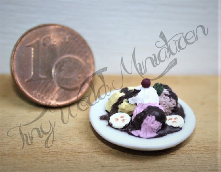 3 Kugeln Eis auf einem weißen Keramikteller (Dm ca. 2 cm) mit Bananenscheiben, Schokosoße, Sahnehäubchen, Kirsche und Minzeblatt für Schlemmerstunden im Puppenhaus.