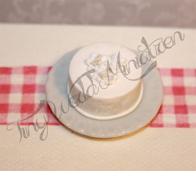 Eine Torte (Dm. ca. 2 cm) mit weißem Fondant überzogen sowie Blumen als Deko für das Kaffeekränzchen im Puppenhaus.